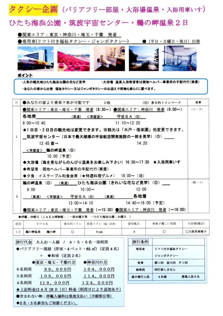 タクシーで偕楽園観光・鵜の岬温泉(障害者・片麻痺・車椅子で旅行を楽しめる・関東おすすめ温泉旅行)。自宅からタクシーで大きな荷物もらくらく移動。リフトやスロープ付き車両で車椅子ごと乗車可能。日本三名園偕楽園と国営ひたち海浜公園の観光、宿泊はバリアフリー対応。温泉は大浴場で入浴用車椅子を使用し楽しめ、温泉入浴ヘルパー手配も大好評です。