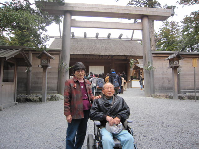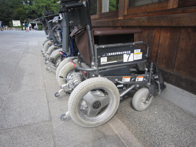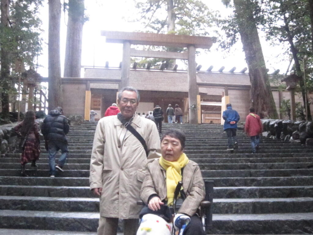 お伊勢参りは外宮と内宮の参拝を添乗員の車いすを押す介助で安心快適に参拝を楽しめました。内宮は社務所で貸出の電動車いすを利用して砂利道を移動し正宮の階段の下まで快適に移動できました。