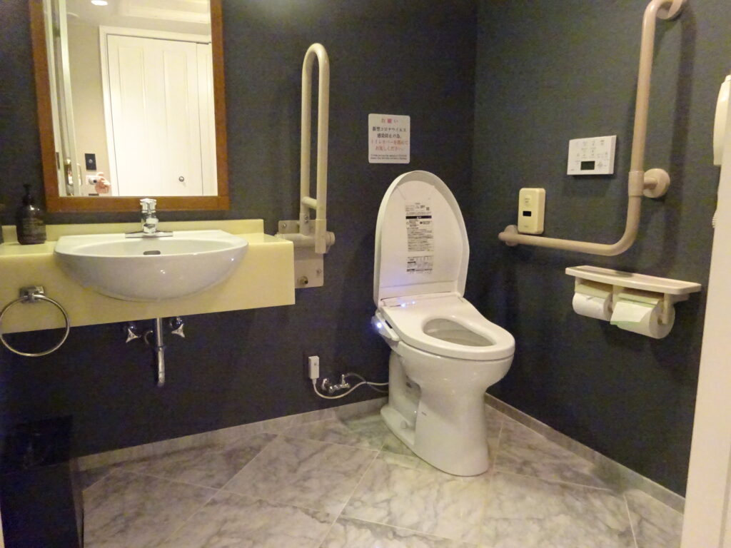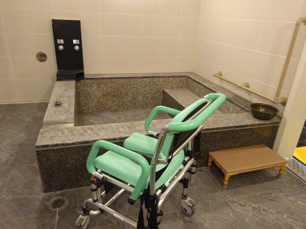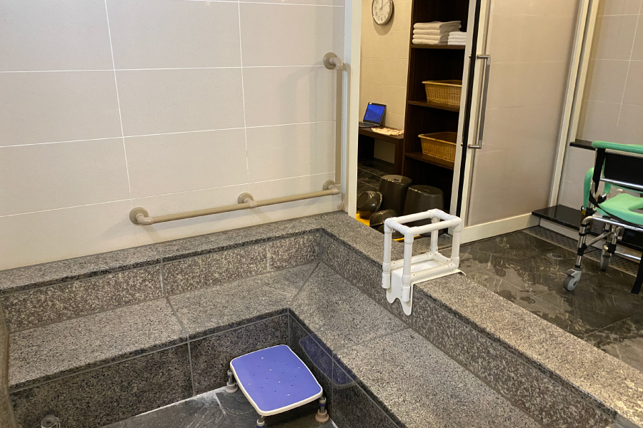バリアフリーの貸切風呂で、入浴用車椅子や浴槽の踏み台や簡易手摺があり、現地温泉入浴ヘルパー手配を心の翼にお願いし、2名のヘルパーさんに手厚いケアで安心快適に温泉を楽しめました。