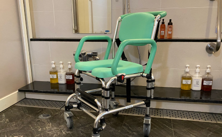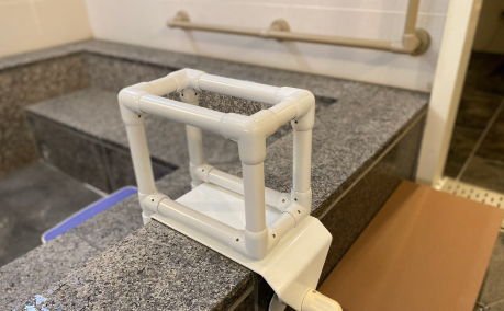 貸切風呂で、入浴用車椅子と湯船に入り時に踏み台と簡易手摺の利用、現地温泉ヘルパー手配を心の翼にお願いしてヘルパー2名で手厚いケアで安心快適に温泉を楽しめました。