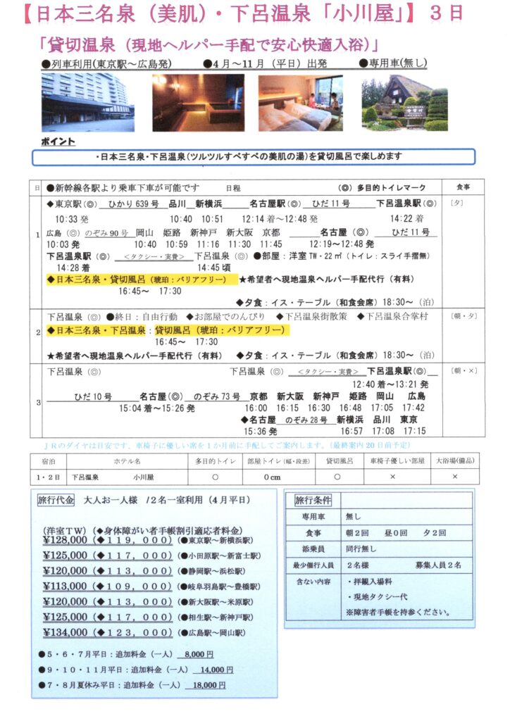 日本三名泉・下呂温泉に連泊(障害者・片麻痺・車椅子で旅行を楽しめる・東海おすすめツアー)。温泉は貸切風呂で畳敷きの安心快適に温泉を楽しめる旅行です。新幹線は車椅子専用席・駅係員の案内付きで、専用タクシー、洋室をご利用いただけ、希望者には温泉入浴介助のヘルパー手配もあり大好評です。