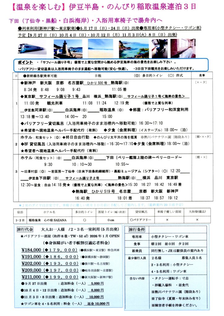 車椅子旅行|伊豆半島の絶景・のんびり稲取温泉連泊3日(白浜海岸/下田観光)。添乗員の同行はありませんが、新幹線最寄り駅からJR駅係員が改札、乗車、乗り換え、到着駅改札まで案内するため安心です。現地ではリフト付きタクシーを利用し、車椅子のまま乗車でき、負担が少なく快適に楽しめます。お宿SAZANAでは、入浴用車椅子のままスロープで湯舟に安心快適に入れる温泉を楽しめ、伊豆下田の観光(白浜海岸・了仙寺・ペリーロードなど)を楽しめるツアーです。