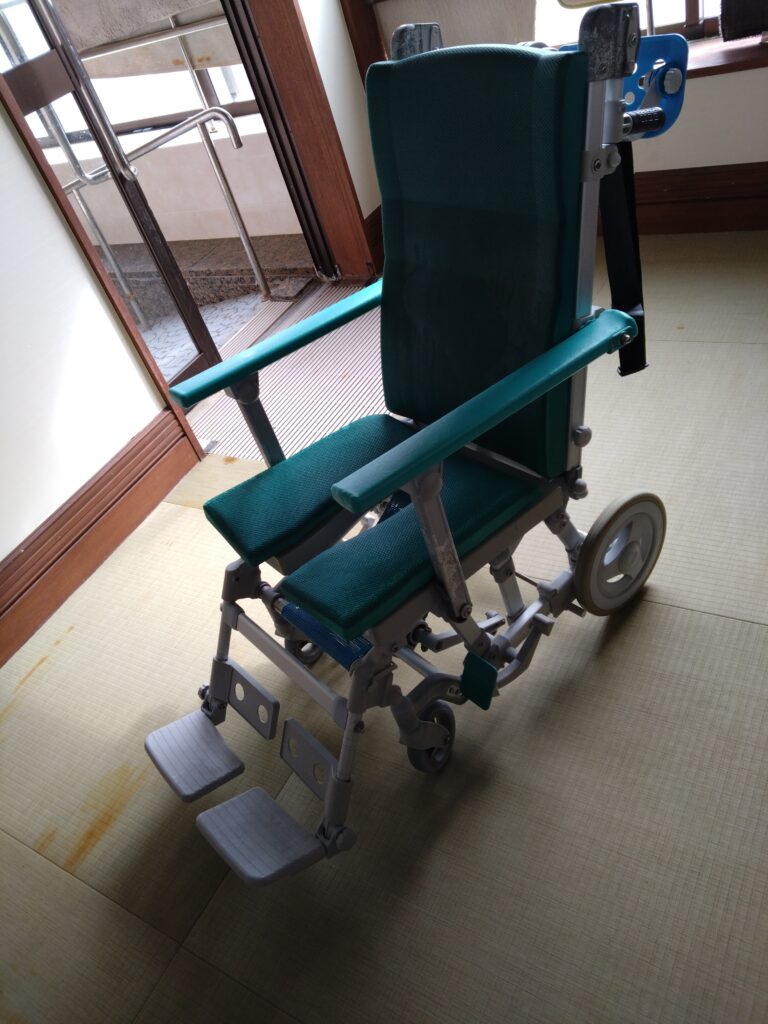 小型タクシー4人乗りをゆったり2名で利用、乗車は横ステップから、折りたたみ車椅子と車椅子に掛けるリュクサックをトランクへ、別の荷物は助手席へ。