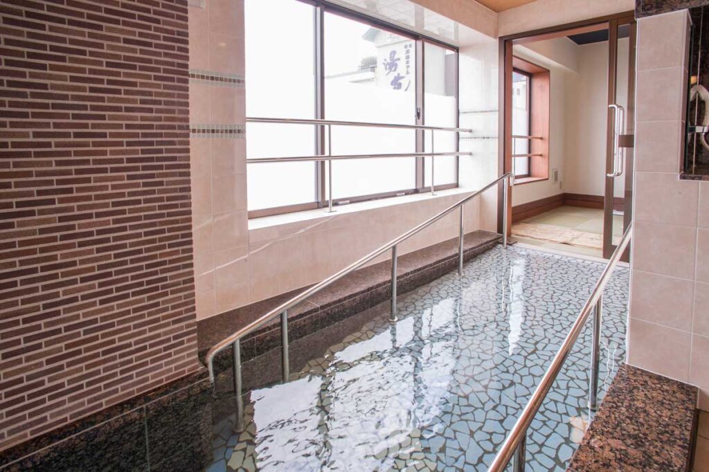 温泉を安心快適に楽しめる。脱衣場で入浴用車椅子に乗り換え、そのままスロープで入れゆっくり浸かれるので安心快適に温泉を楽しめます。