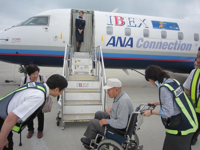 ⑥到着時は最後の案内で席から航空会社の車椅子で機内出口へ