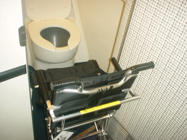 ⑤機内トイレ(機内用小さい車椅子で移動・狭く小さい手摺のみ・介助空間はかなり狭い)