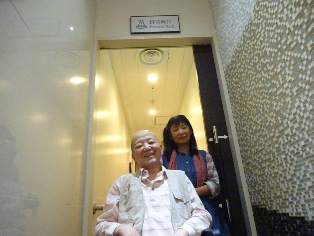 バリアフリー部屋(電動ベット)を利用し、貸切風呂は貸出備品の入浴用車椅子と簡易手摺・踏み台で安心快適に温泉を楽しまれてくいださい。