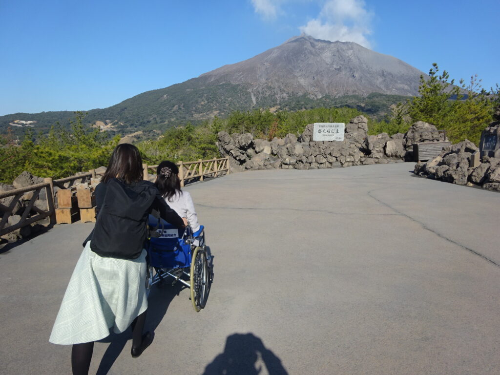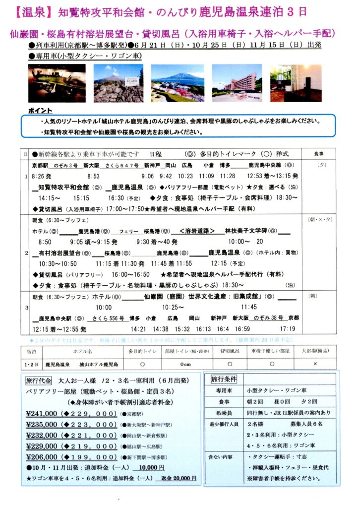 車椅子旅行|のんびり鹿児島温泉連泊3日(知覧特攻平和会館・仙厳園・桜島)。添乗員の同行はありませんが、新幹線最寄り駅からJR駅係員が改札、乗車、乗り換え、到着駅改札まで案内するため安心です。現地はタクシーを利用し快適に楽しめます。お宿は人気の城山ホテル鹿児島のバリアフリー部屋と貸切風呂は入浴用車椅子を利用し安心快適に温泉を楽しめ、知覧特攻平和会館の映像や世界遺産の仙厳園や桜島の観光を楽しめるツアーです。