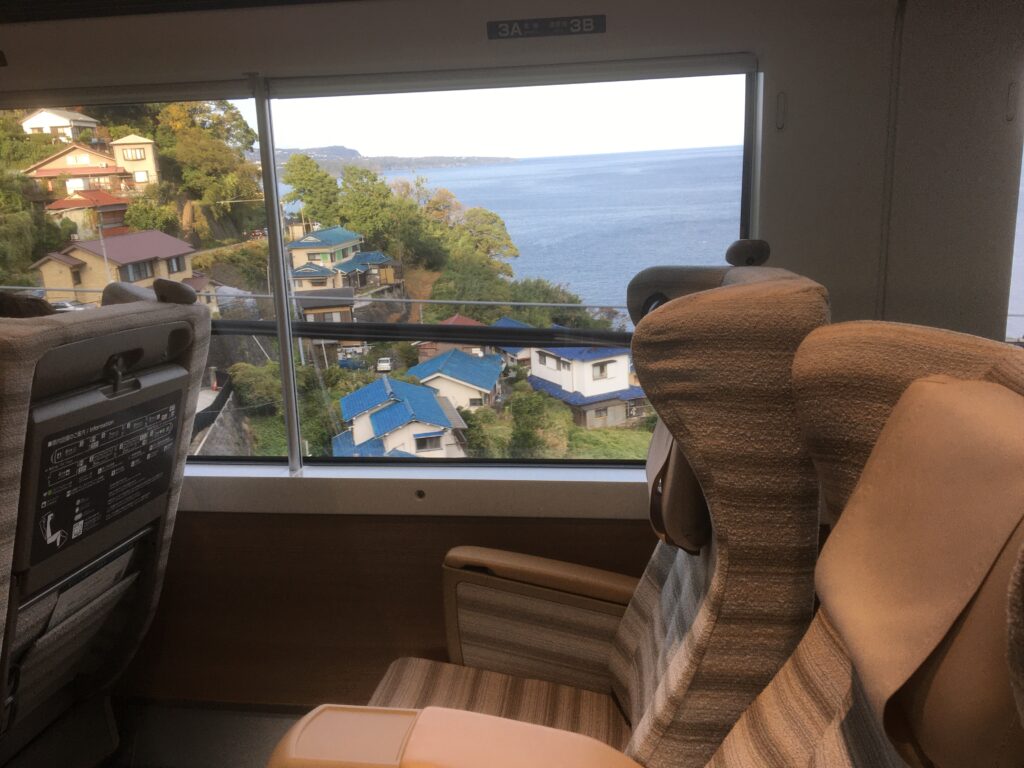 観光列車サフィール号で、優雅で上質な空間から眺める伊豆の海岸の海の景色をお楽しめます。