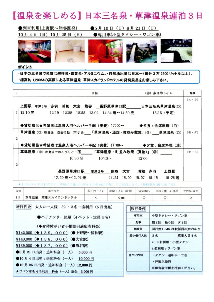 車椅子旅行|日本の三名泉・のんびり草津温泉連泊3日。添乗員の同行はありませんが、新幹線最寄り駅からJR駅係員が改札、乗車、乗り換え、到着駅改札まで案内するため安心です。現地はタクシーを利用し快適に楽しめます。お宿は草津スカイランドホテルのバリアフリー部屋を利用、温泉は貸切風呂で現地温泉入浴ヘルパー手配して安心快適に入れる温泉を楽しめるツアーです。