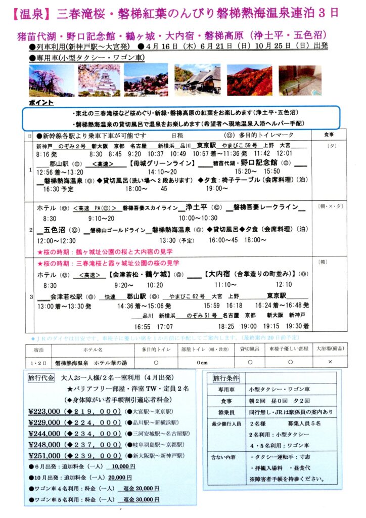 車椅子旅行|磐梯高原・磐梯熱海温泉連泊3日(三春滝桜・新緑・紅葉)。添乗員の同行はありませんが、新幹線最寄り駅からJR駅係員が改札、乗車、乗り換え、到着駅改札まで案内するため安心です。現地はタクシーを利用し快適に楽しめます。日本三大桜の名所・三春滝桜や磐梯吾妻スカイライン(浄土平・五色沼)の新緑や紅葉、鶴ヶ城・大内宿の宿場町・猪苗代湖を楽しみ、磐梯熱海温泉を貸切風呂で楽しんでいただけるツアーです。