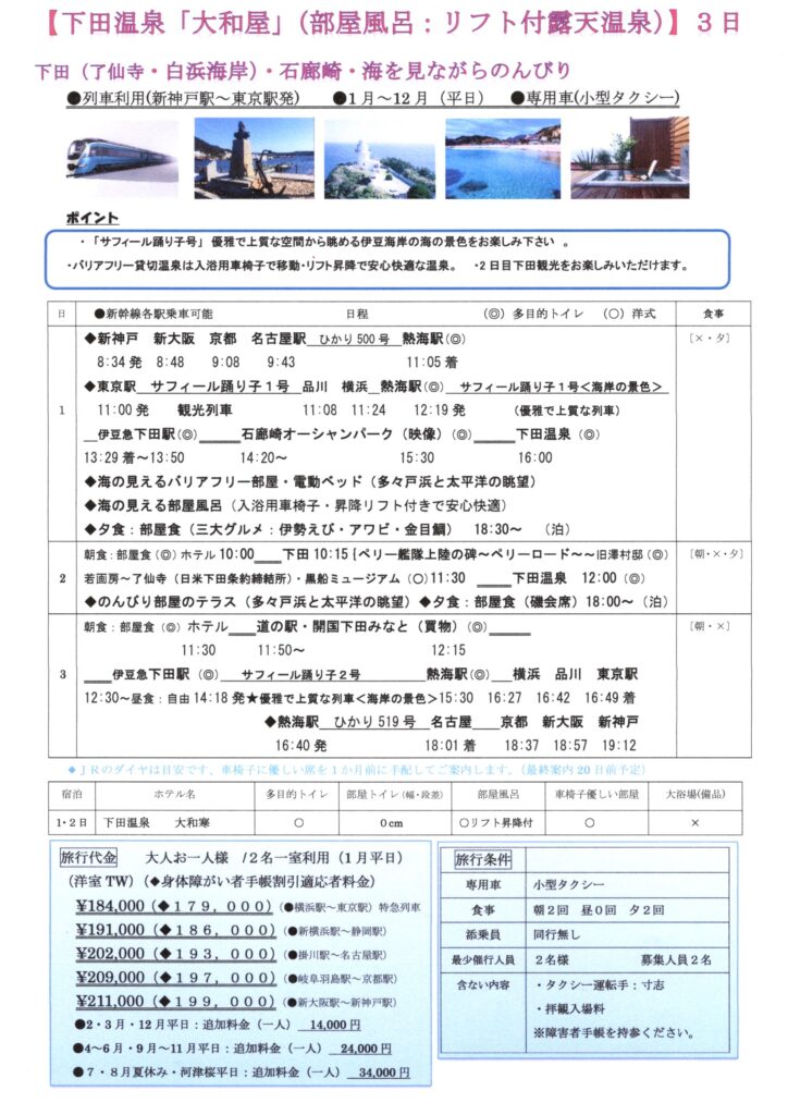 伊豆半島・下田温泉にのんびり連泊(障害者・片麻痺・車椅子で旅行を楽しめる・東海おすすめツアー)。お部屋は電動ベッドでテラスから海の眺望、温泉は部屋の露天風呂で海を見ながら入浴用車椅子のままリフト昇降機付で安全快適に楽しめる旅行です。新幹線・特急列車は車椅子専用席・駅係員の案内付きで、専用タクシーをご利用いただけます。