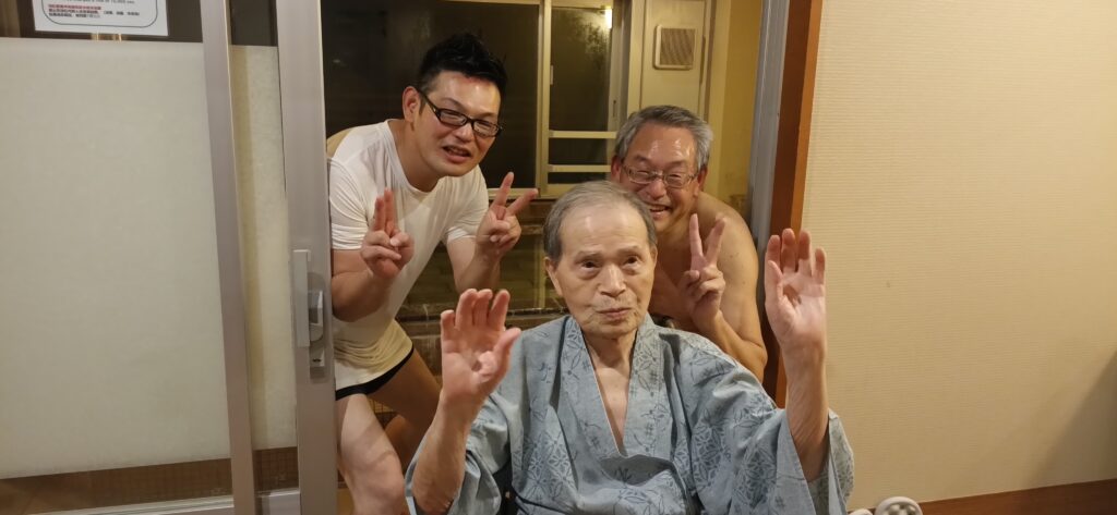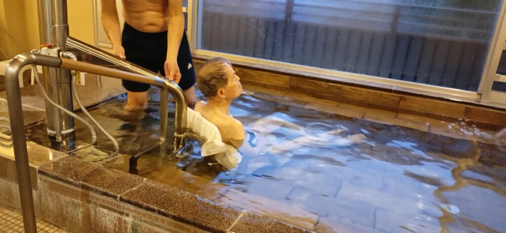 パーキンソン病で車椅子生活の父「温泉に浸かりたい」を現地ヘルパー手配で実現の笑顔に大感動。手引きで数歩だけ歩ける父ですが、バリアフリーの部屋(電動ベット)とバリアフリーの温泉(入浴用車椅子・昇降リフト付き)、添乗員のきめ細かい介助で家族のリフレッシュ、心の翼から現地のヘルパー手配で安心快適に温泉に浸かっている父の笑顔の感謝です。
