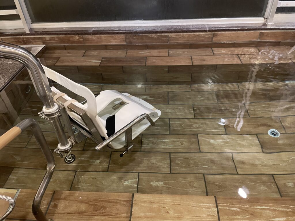 宿泊の貸切風呂(入浴用車椅子・脱衣場の立ち上がり手摺・昇降リフト・入浴風景)