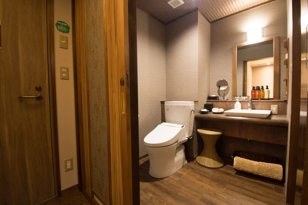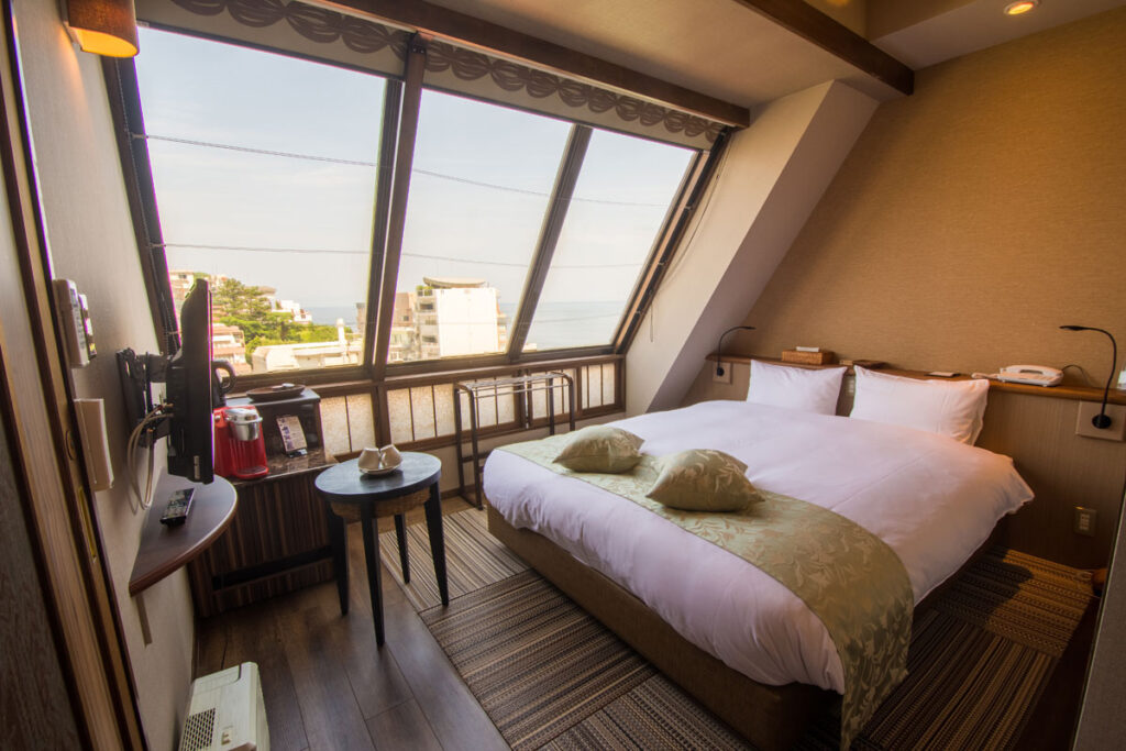 稲取温泉の心の宿SAZANAの車椅子にやさしい洋室を利用していただけます。玄関でスリュパに履き替える宿ですが、車椅子の方は玄関でタイヤを拭き車椅子のまま館内移動をしていただき、室内や貸切風呂の脱衣場や食事処の移動できます。