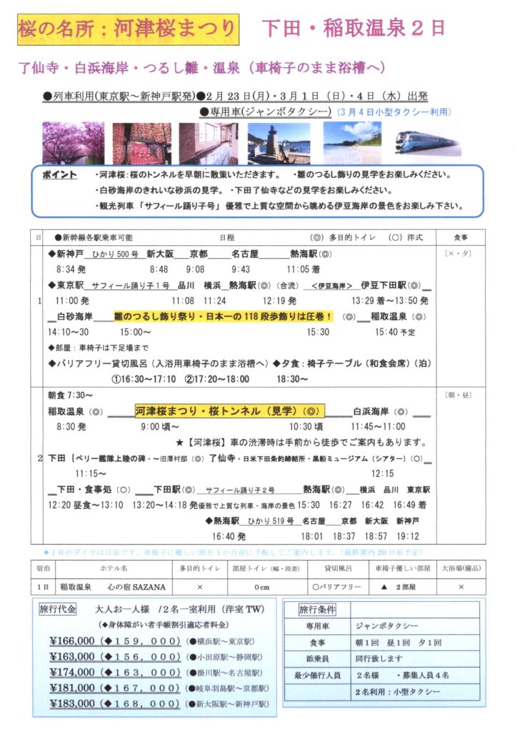 伊豆・河津桜まつり桜のトンネル・下田観光・稲取温泉(障害者・片麻痺・車椅子で楽しめる添乗員同行ツアー)。濃いピンク色に染まる河津桜は、川沿いに約8,000本咲き誇る桜トンネルもあります。下田観光は了仙寺をはじめ白砂海岸は透き通った海に魅了されます。稲取温泉はバリアフリー車椅子のまま浴槽へ入れる温泉を楽しめるツアーです。