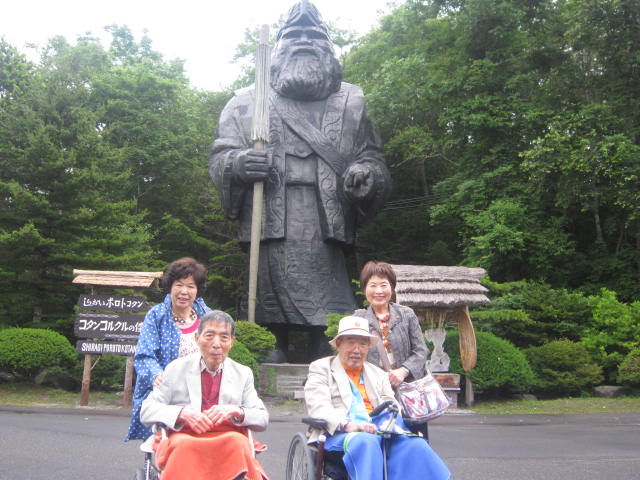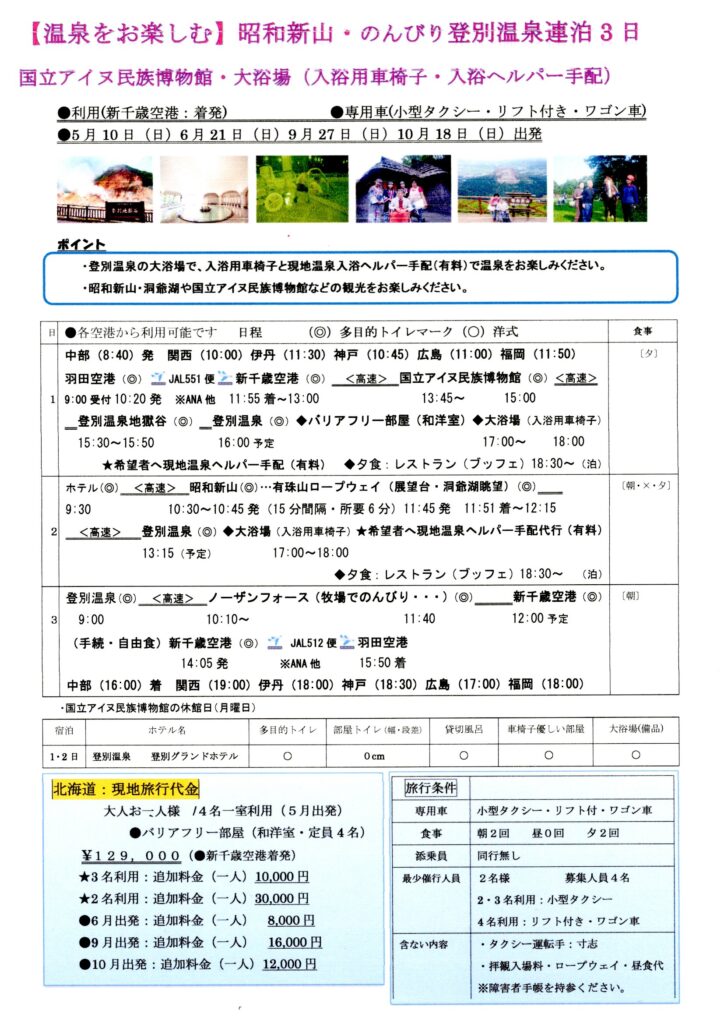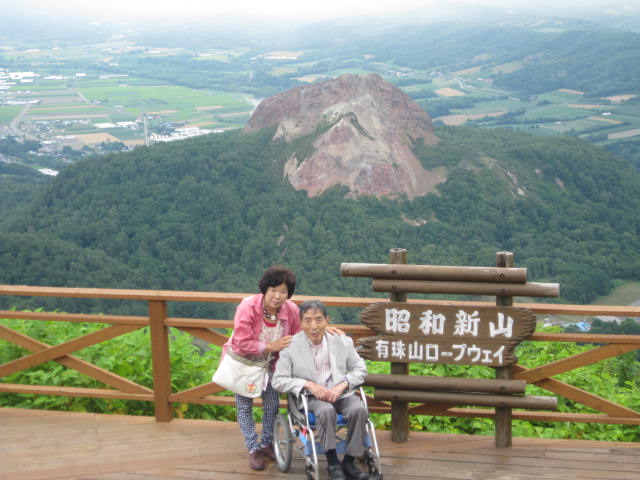 車椅子旅行・北海道現地ツアー|北海道のんびり登別温泉連泊3日(昭和新山・有珠山・洞爺湖・国立アイヌ民族博物館)。添乗員の同行はありませんが、飛行機はお客様手配ですが、各航空会社のサポートデスクで車椅子の配慮があり係員案内があるので安心です。現地ではタクシーを利用し快適に楽しめます。登別グランドホテルのバリアフリー部屋(和洋)を利用し、大浴場で入浴用車椅子を利用し温泉を楽しめ、希望者へ現地温泉ヘルパーの手配代行(有料)があり快適に温泉を楽しんでいただけるツアーです。