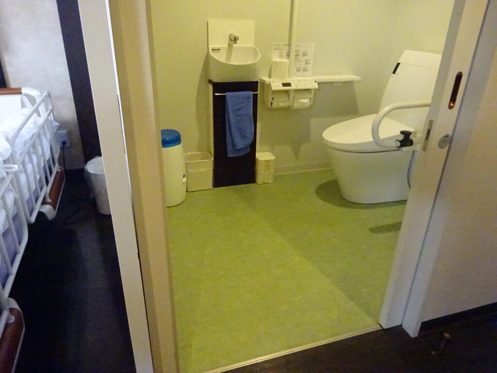⑤機内トイレ(機内用小さい車椅子で移動・狭く小さい手摺のみ・介助空間はかなり狭い)