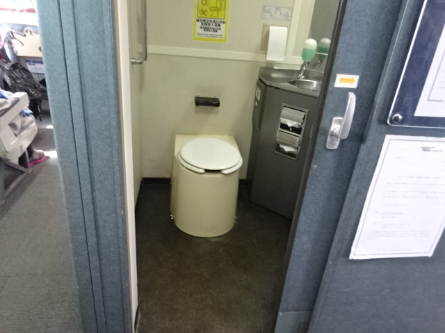 ⑤機内トイレ(機内用小さい車椅子で移動・狭く小さい手摺のみ・介助空間はかなり狭い)