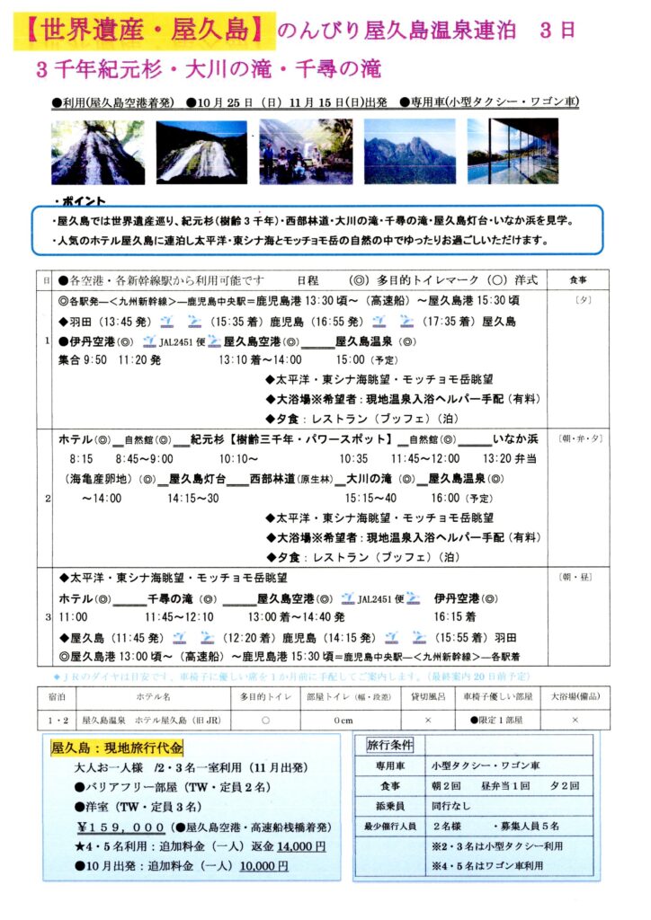 車椅子旅行・屋久島現地ツアー|のんびり屋久島温泉連泊3日(樹齢3,000年紀元杉)【2026年10月25日・11月15日出発】(募集中)。添乗員の同行はありませんが、飛行機はお客様手配ですが、各航空会社のサポートデスクで車椅子の配慮があり係員案内があるので安心です。現地ではタクシーを利用し快適に楽しめます。ホテル屋久島のバリアフリー部屋を利用し、大浴場で温泉を楽しめ、希望者へ現地温泉ヘルパーの手配代行(有料)があり快適に温泉を楽しんでいただけるツアーです。