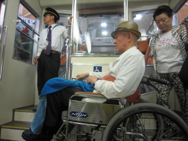 ジャンボタクシー9人乗りをゆったり4名で利用、乗車は横ステップから、折りたたみ車椅子と荷物は後部収納へ。