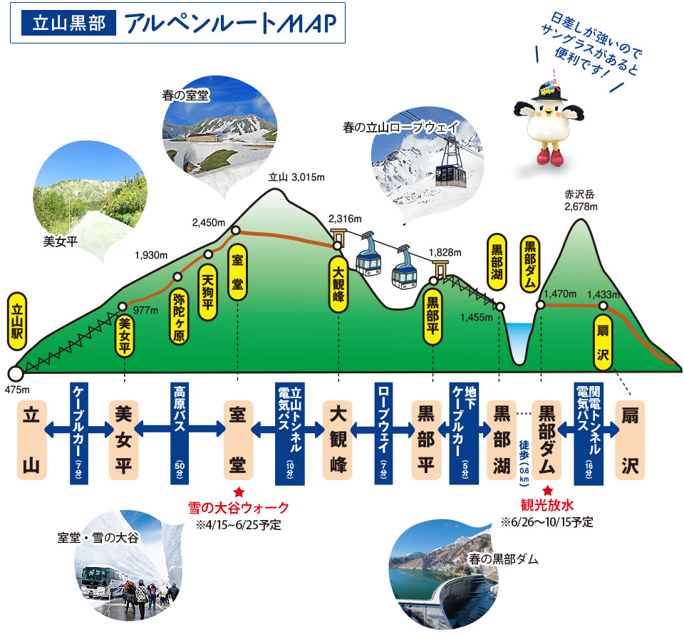 立山黒部アルペンルートはケーブルカー・高原バスを乗り継ぎ室堂平へ移動して【雪の大谷】を見学いただきます。立山黒部アルペンルートのスタッフに合理的配慮をしていただきます。