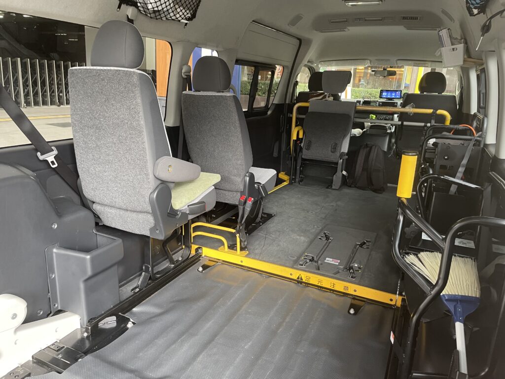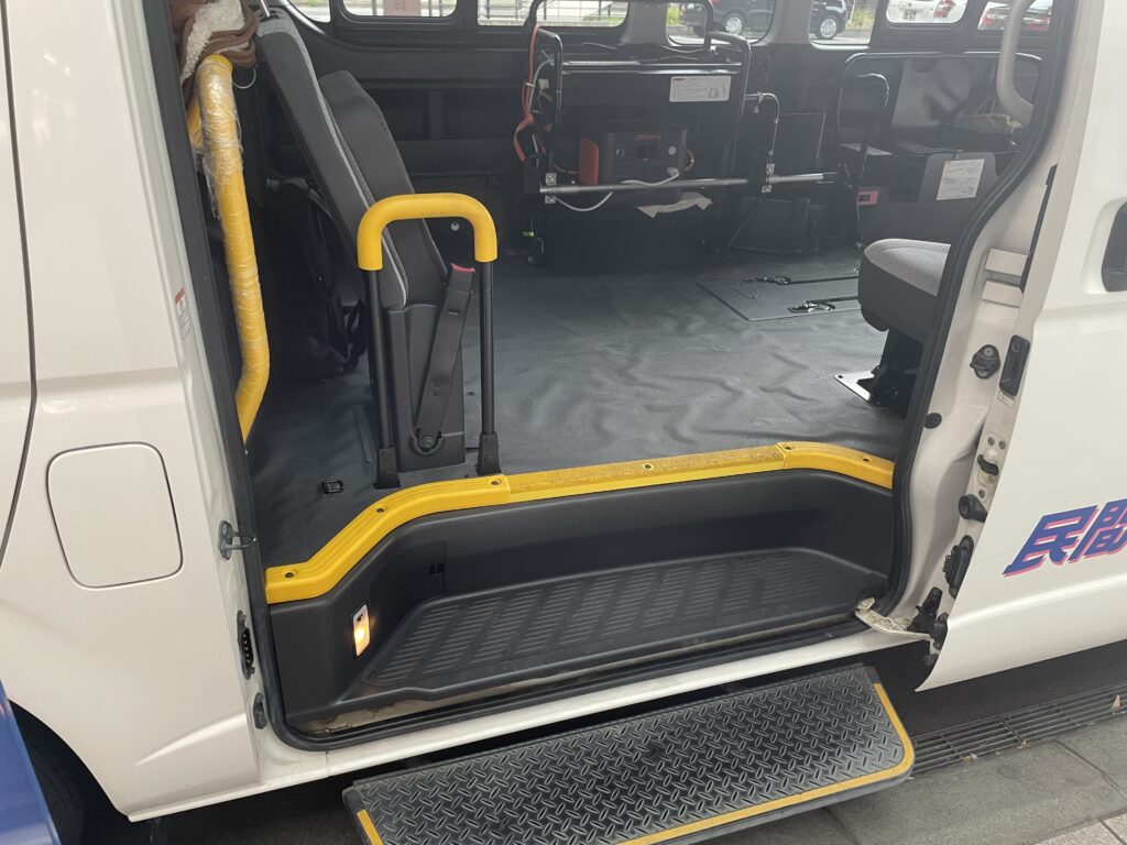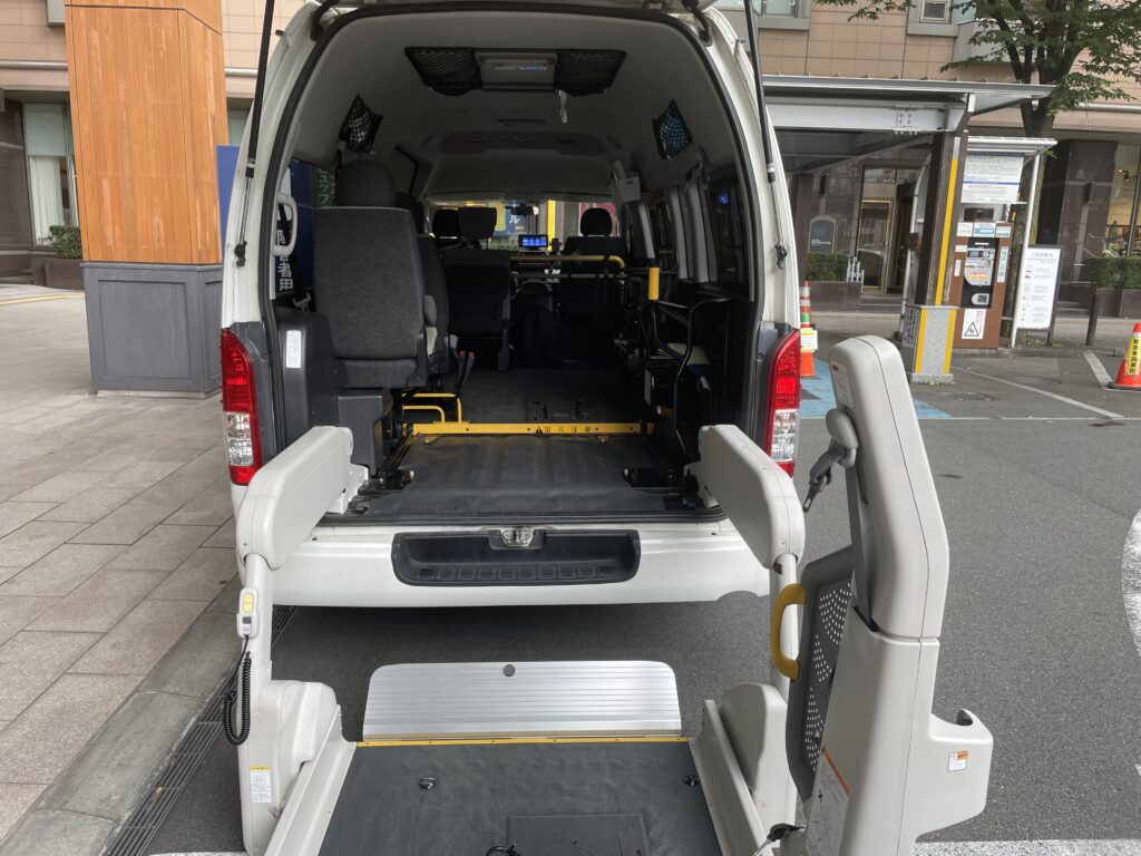 リフト付きタクシー5人乗りをゆったり4名で利用、乗車は車椅子ごとリフト昇降で車内へ移乗できます。横ステップから、踏み台と手すりで車内へ移乗いただけます。