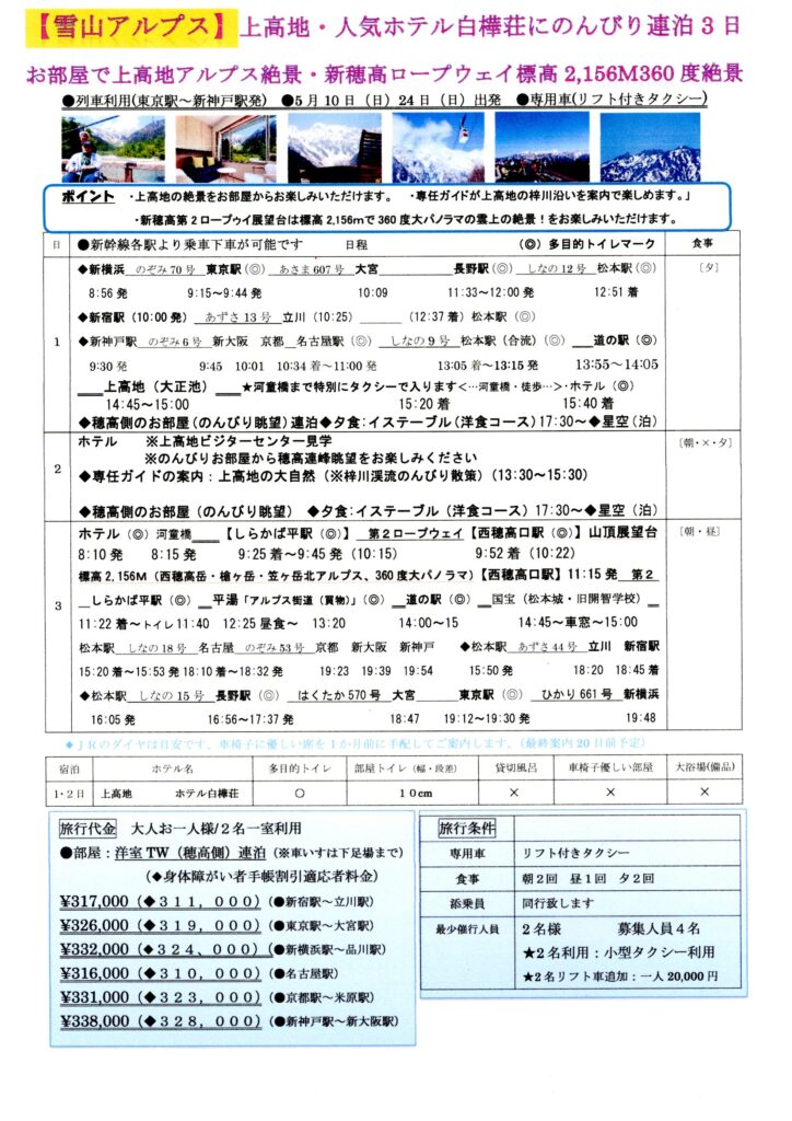 車椅子旅行|のんびり上高地連泊・雪の北アルプス3日 (リフト付タクシー)杖歩行や車椅子の方の旅行新幹線最寄りの駅から出発し、福祉タクシーリフト付きに小人員数4名で、のんびりゆったりベテラン添乗員同行の安心な案内で、人気の上高地、ホテル目の前に広がる北アルプス・穂高連山新穂高ロープウェイ(標高2,156M)の360度北アルアルプスの大パノラマ展望台雲上の景色を楽しんでいただけるツアーです。