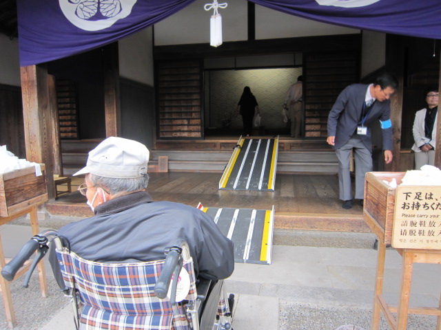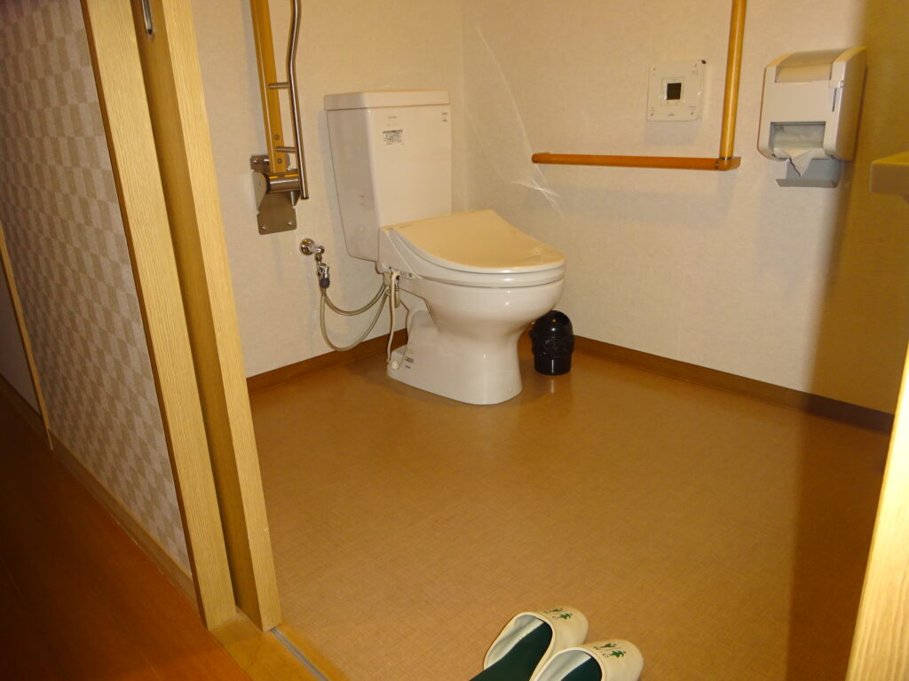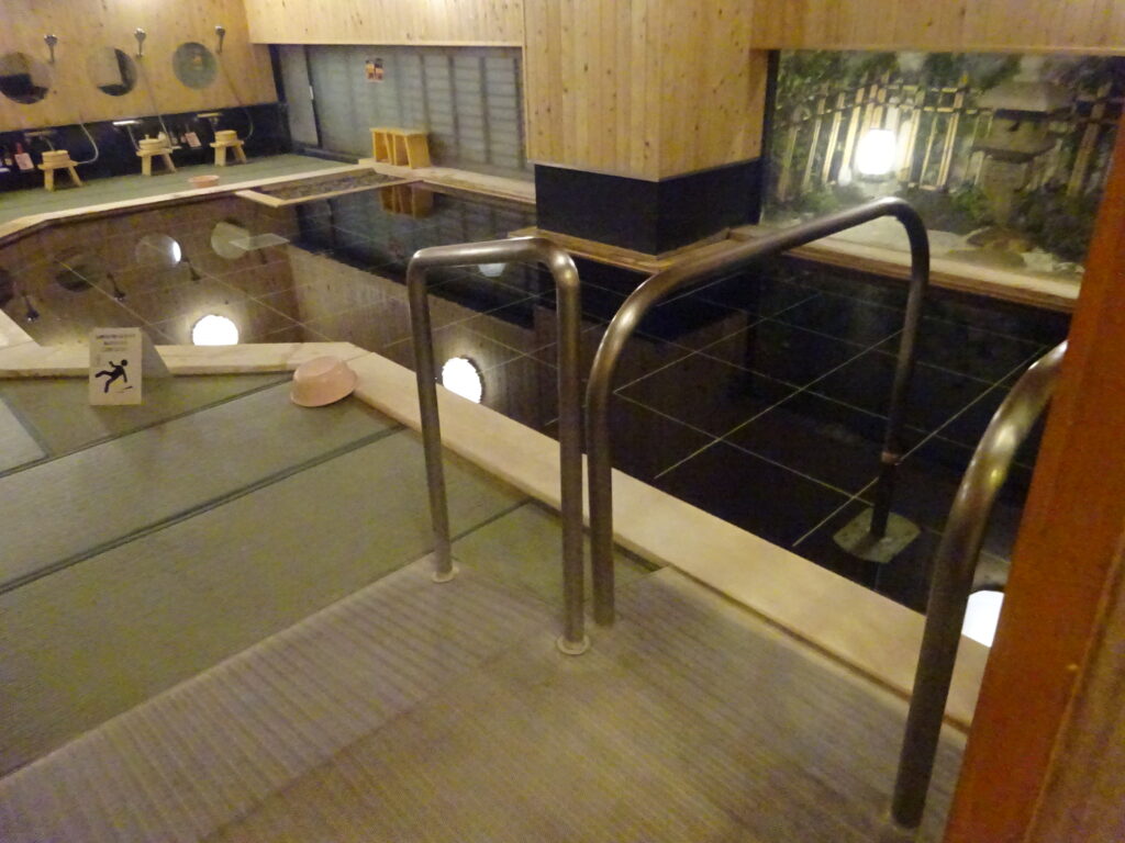 飛騨高山温泉の大浴場は畳敷きです。入浴用車椅子を利用し同性の家族のケアで温泉を楽しめます。