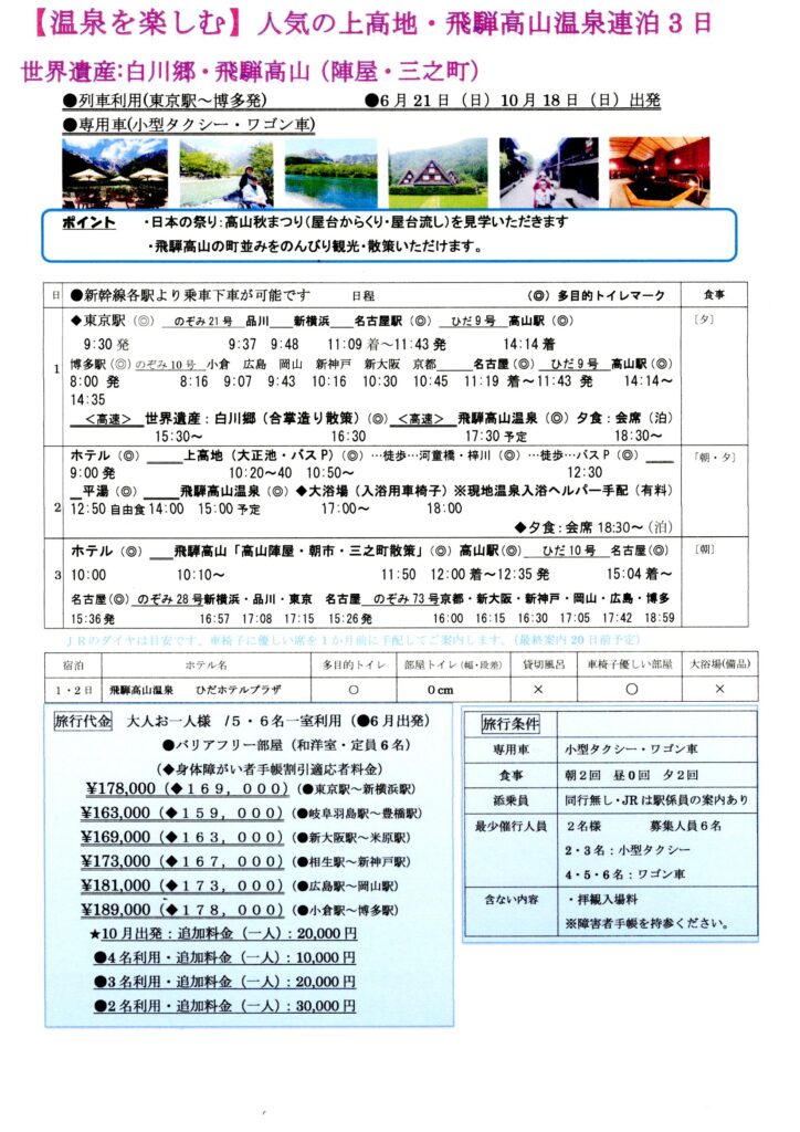 車椅子旅行|のんびり飛騨高山連泊3日(白川郷・飛騨高山・人気の上高地)。添乗員の同行はありませんが、新幹線最寄り駅からJR駅係員が改札、乗車、乗り換え、到着駅改札まで案内するため安心です。現地でタクシーを利用し快適に楽しめます。人気の上高地の大正池や河童橋からの絶景、世界遺産の白川郷、飛騨高山は高山陣屋や三之町散策を楽しめるツアーです。