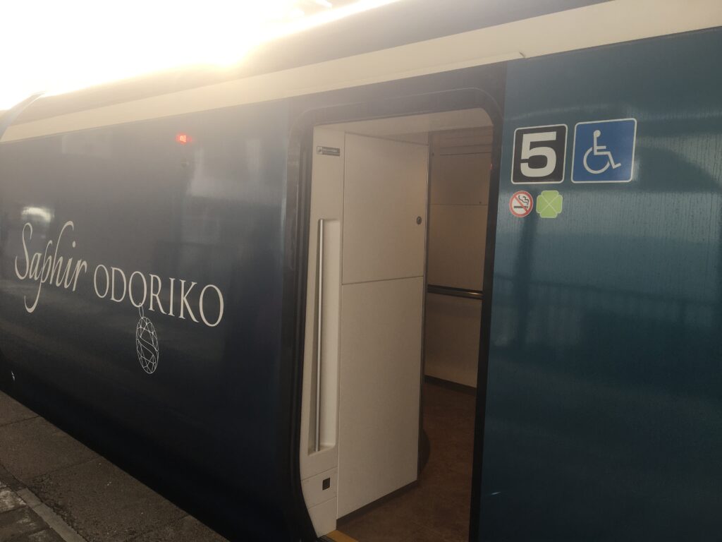 観光列車サフィール号で、優雅で上質な空間から眺める伊豆の海岸の海の景色をお楽しめます。
