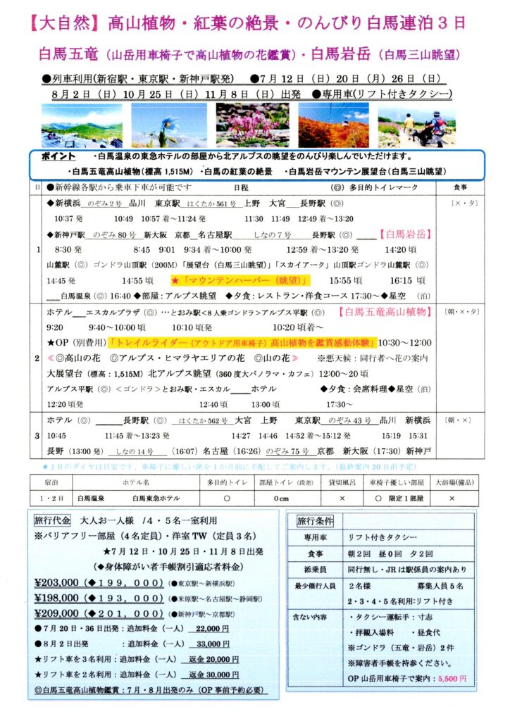 車椅子旅行|白馬の絶景!のんびり連泊3日(高山植物・紅葉/リフト付きタクシー)。添乗員の同行はありませんが、新幹線最寄り駅からJR駅係員が改札、乗車、乗り換え、到着駅改札まで案内するため安心です。現地ではリフト付きタクシーを利用し、車椅子のまま乗車でき、負担が少なく快適に楽しめます。白馬五竜では山岳用車椅子で高山植物のきれいな花の鑑賞や白馬岩岳の展望は白馬三山の絶景スポットを楽しめます。人気のリゾート白馬東急ホテルのひと時を楽しんでいただけるツアーです。