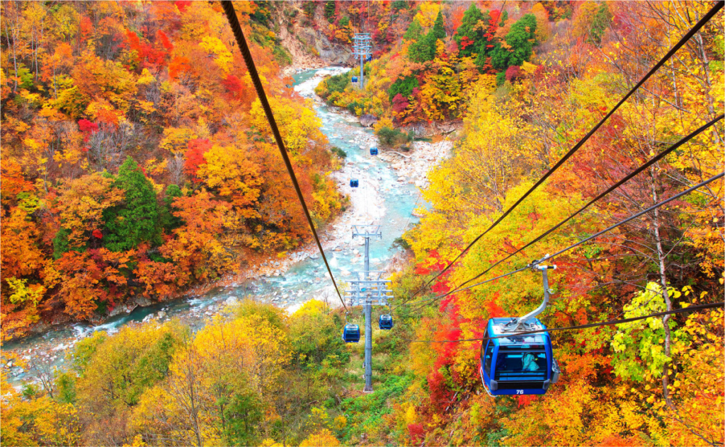 紅葉の絶景「苗場ドラゴンドラ・長さ日本一5.4キロ(赤・黄色に染まる紅葉を満喫)をお楽いただけます。