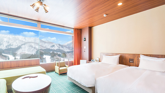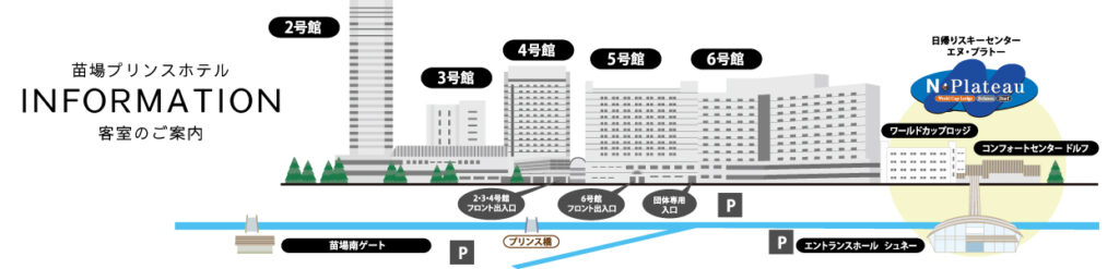 苗場の苗場プリンスホテル、館内には多目的トイレあり、お部屋は洋室を利用、いただけます。