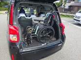 小型タクシー4人乗りをゆったり2名で利用、乗車は横ステップから、折りたたみ車椅子と車椅子に掛けるリュクサックをトランクへ、別の荷物は助手席へ。