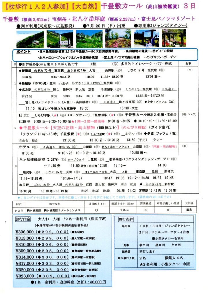 杖歩行の方の旅行|千畳敷カール夏の高山植物の絶景・北八ヶ岳3日。高齢者や障害者の方、片麻痺や介助が必要な方、杖で歩ける方が楽しめる千畳敷カールの絶景ツアー!新幹線最寄りの駅から出発し、ジャンボタクシーに小人員数6名で、のんびりゆったりベテラン添乗員同行の安心な案内で、駒ヶ岳ロープウェイで千畳敷カール(標高2,612Mテラスから宝剣岳の絶景)夏のベストシーズン高山植物を専任ガイドとゆっくり歩き鑑賞を楽しめ、北八ヶ岳ロープウェイの坪庭のパノラマや蓼科高原のイングリッシュガーデンを楽しんでいただけるツアーです。