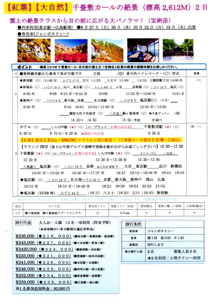 車椅子旅行|紅葉の千畳敷カール・標高2612m雲上の絶景!2日【9月27日(日)・30日(水)10月12日(月)・15日(木)出発】(募集中)