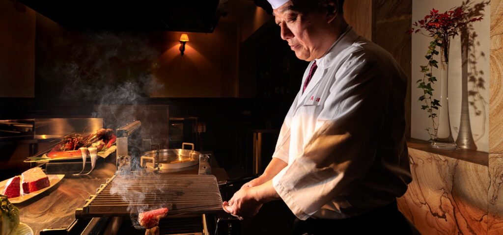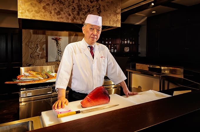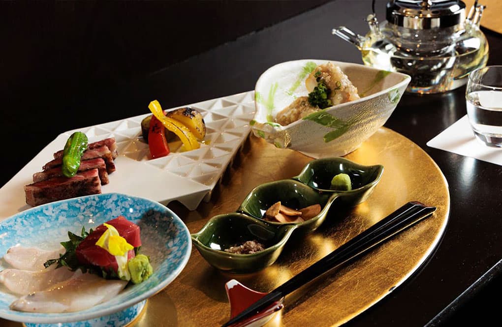 ホテルの夕食「和食ダイニング赤富士」 で、臨場感あふれるダイニングカウンターの目の前で板前が料理を仕上げ、出来立てを提供する、和食割烹の醍醐味をお楽しみしみいただけます。
