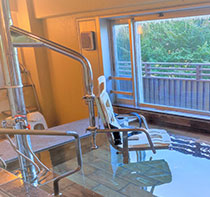 貸切風呂で入浴用車椅子を利用し昇降機リフト付き温泉なので安心快適に温泉お楽しんでいただけます。また部屋風呂もひのきの温泉を楽しめます。