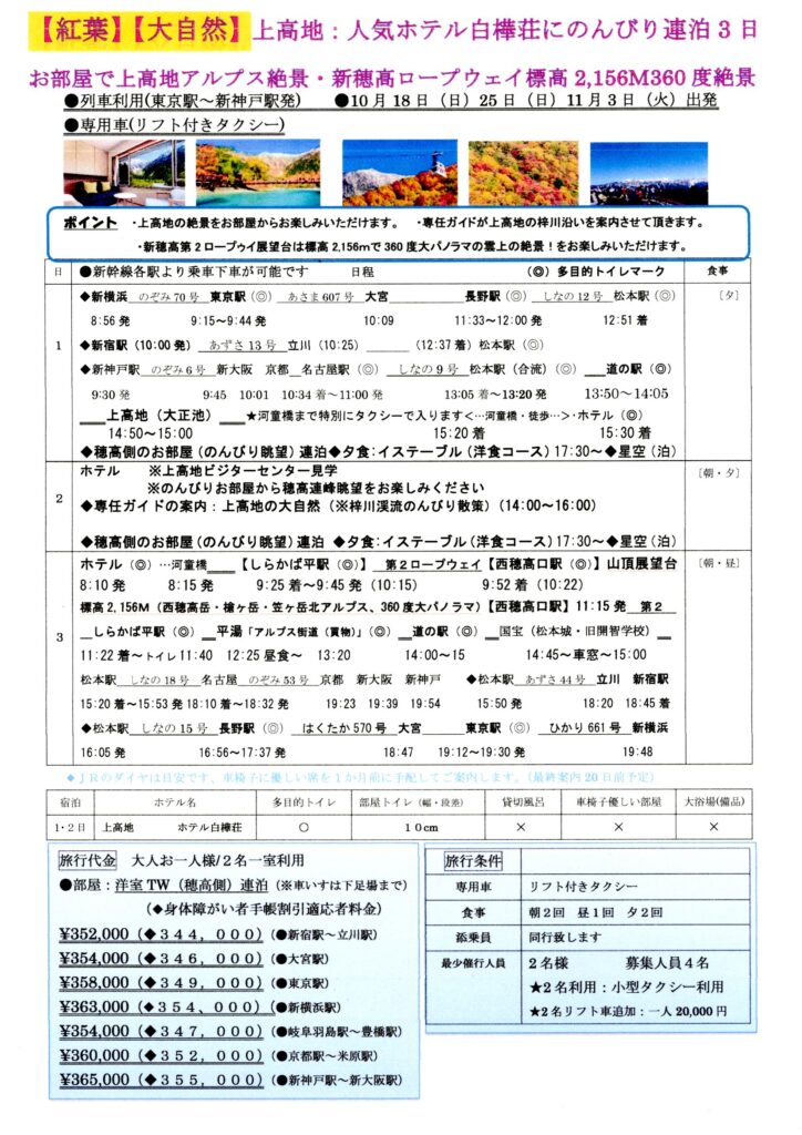 車椅子旅行|紅葉の絶景・北アルプス・のんびり上高地連泊3日(リフト付タクシー)。杖歩行や車椅子の方の旅行、新幹線最寄りの駅から出発し、福祉タクシーリフト付きに小人員数4名で、のんびりゆったりベテラン添乗員同行の安心な案内で、人気の上高地のホテル白樺荘のお部屋の絶景眺望・梓川の清流と穂高連峰の紅葉の絶景と車椅子の配慮を受け、新穂高ロープウェイで標高2,156Mの360度紅葉の北アルプスの展望台の雲上の景色を楽しんでいただけるツアーです。