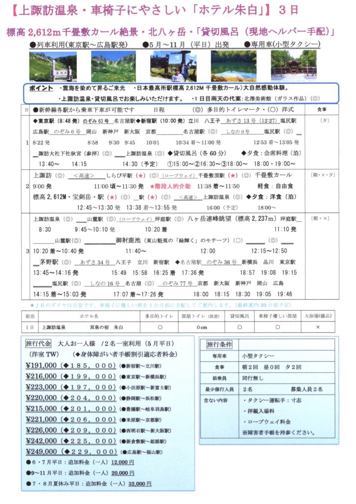 大自然の絶景!千畳敷カール・北八ヶ岳・上諏訪温泉に連泊(障害者・片麻痺・車椅子で旅行を楽しめる・甲信越おすすめツアー)。標高2612m千畳敷カール、標高2237m北八ヶ岳の感動体験ができる旅行です。新幹線は車椅子専用席・駅係員の案内付きで、専用タクシー、バリアフリー部屋、温泉は貸切風呂で楽しめます。